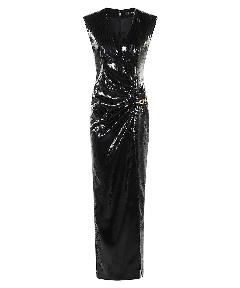 Balmain GF1RPB05XL64 SS GOLD DETAIL SEQUINS SLIT LONG Dress - Black